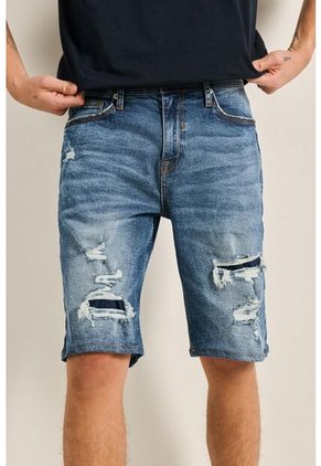 Bermuda en jean para hombre en tono azul oscura cuenta con 5 bolsillos funcionales, detalles con rotos delanteros, tiro bajo y una silueta ligeramente ajustada al cuerpo. Inspirada en la moda casual, podrás combinarla con una camiseta oversize y crear un atuendo perfecto para disfrutar de tus planes más descomplicados.