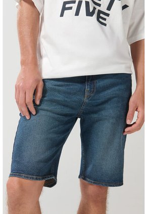 Bermuda en jean azul oscura tipo slim para hombre cuenta con costuras en contraste visibles, 5 bolsillos funcionales, tiro bajo, pretina con botón metálico y un fit ajustado al cuerpo. Renueva tu guardarropa con esta prenda, será la opción perfecta para lucir con tus camisetas favoritas en tu próxima salida con amigos.