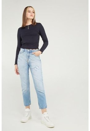Blusa para mujer, en tela de cuerpo unicolor, cuello redondo, botones y manga larga.