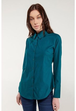 Blusa para mujer, en tela de cuerpo unicolor, cuello sport, manga larga y cierre frontal con botones.