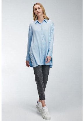 Blusa en tela fluida unicolor, manga larga con charretera y cuello camisero.