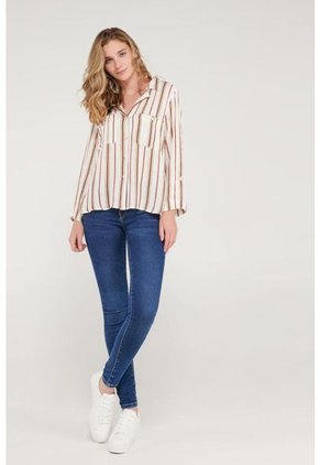 Blusa para mujer, en tela de cuerpo estampado, cuello sport, manga larga y cierre frontal con botones.