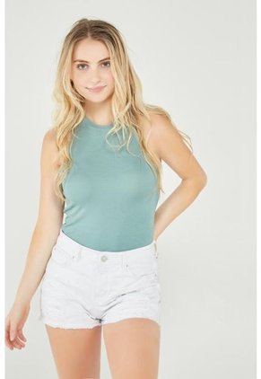 Body para mujer, en tela de cuerpo unicolor, sin mangas, con cuello alto, silueta ajustada, y cierre en bajo.