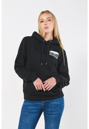 Buzo con capota para mujer en tono negro cuenta con manga ranglan larga, bolsillo delantero, diseño college deportivo en el pecho, cordón para anudar y un fit ligeramente holgado en el cuerpo. Tu lado más juvenil se reflejará con esta prenda, lúcela con un jean ajustado y crea un look perfecto para todo momento.