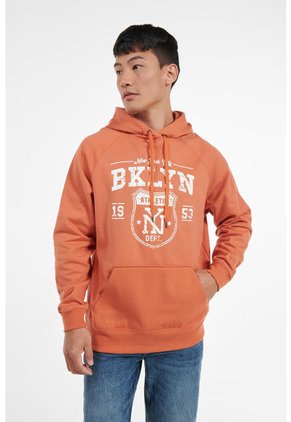 Buzo naranja claro con capota para hombre tiene bolsillo delantero, puños y ruedo en rib, estampados college blancos de Brooklyn, cordón ajustable en el cuello y un fit ceñido al cuerpo. Protégete de los días fríos con esta prenda, lúcela con tus jeans favoritos y mantente abrigado y con un estilo moderno.
