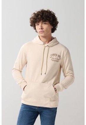 Buzo para hombre con capota kaki claro cuenta con ruedo y puños en rib, cordón para anudar, manga larga, bolsillo delantero, texto estampado en frente y un fit ligeramente ajustado. Si buscas darle un toque moderno a tu look, esta es la prenda adecuada, combínala con tu jean favorito y lúcela en una salida casual.