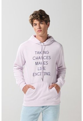 Buzo unicolor con capota para hombre cuenta con cordón para anudar, puños y ruedo en rib, manga larga, texto estampado en frente, bolsillo delantero y una silueta ajustada. Esta prenda añade una pizca juvenil a tu outfit. ¡Con un jean slim o 90´S estarás listo para destacarte en cualquier ocasión!