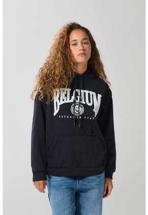 Buzo con capota para mujer en tono azul intenso cuenta con puños y ruedo en rib, diseño college en frente, bolsillo delantero, cordón para anudar, hombro caído, manga larga y un fit oversize. Infaltable en tu outfit, podrás lucirlo con tu jean favorito y marcar la diferencia en tus planes diarios o días fríos.