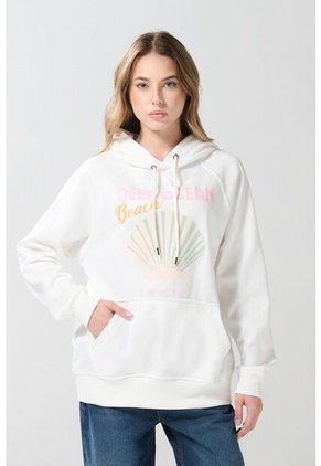 Buzo con capota crema claro para mujer cuenta con diseño de playa estampado en frente, puños y ruedo en rib, manga ranglan larga, bolsillo delantero, cordón para anudar y un fit oversize. Viste casual sin perder tu estilo urbano combinando esta prenda con jeans baggy o cargo. ¡Tu look brillará con luz propia!