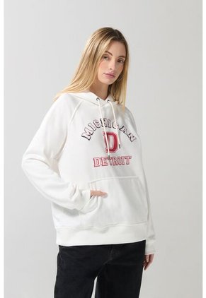 Buzo con capota para mujer en tono crema claro cuenta con manga ranglan larga, tejidos en rib en ruedo y puños, diseño college en frente, bolsillo delantero, cordón para anudar y un fit oversize. Esta prenda tiene el estilo original que tu outfit tanto necesita, lúcela con tu mejor jean y llévala para disfrutar de un plan casual con amigas.