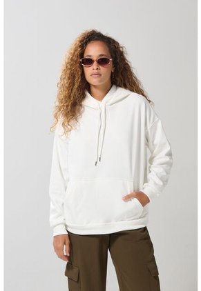 Buzo con capota crema claro para mujer, confeccionado en tela perchada, cuenta con bolsillo delantero, puños y ruedo en rib, manga larga, cordón para anudar y un fit oversize. ¡Despreocúpate del frío con esta prenda! Combínala con un jean mom y crea un look abrigador con el que te identifiques.
