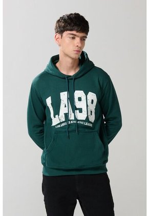 Buzo con capota para hombre en tono verde oscuro cuenta con ruedo y puños en rib, cordón para anudar, bolsillo en frente, manga larga, diseño college y un fit ligeramente ajustado al cuerpo. Perfecto para una tarde con amigos, podrás combinarlo con un jean skinny y crear un atuendo inspirador.