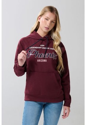 Buzo con capota rojo oscuro para mujer cuenta con manga ranglan larga, puños y ruedo tejidos en rib, bolsillo delantero, cordón para anudar, diseño college y una silueta oversize en el cuerpo. Completa tu propia colección con esta prenda, podrás usarla en tus planes diarios con jeans baggy, cargo o 90´S.