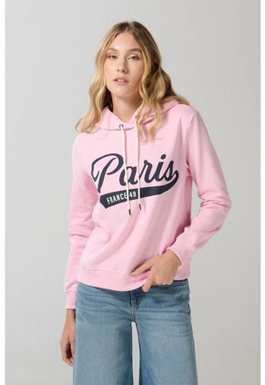Buzo con capota rosado claro para mujer cuenta con ruedo y puños tejidos en rib, bolsillo delantero, cordón para anudar, manga larga, diseño college en frente y un fit ligeramente ajustado al cuerpo. Combínalo con tus jeans Koaj favoritos y crea cientos de outfits versátiles con los que marques la diferencia en los días fríos.
