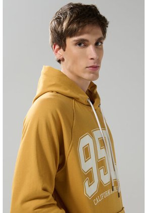 Buzo con capota amarillo oscuro para hombre cuenta con ruedo y puños tejidos en rib, manga ranglan larga, cordón para anudar, diseño college en frente, bolsillo delantero y una silueta holgada. Esta prenda renovará tu guardarropa, combínala con tus jeans Koaj favoritos y crea atuendos perfectos para todos los días.