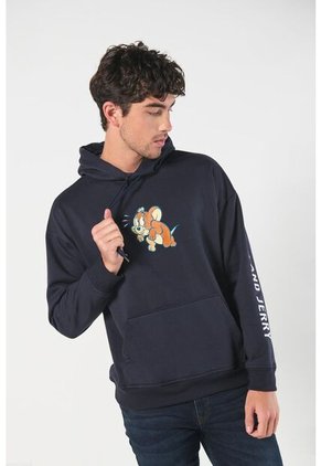 Buzo con capota azul intenso para hombre cuenta con puños y ruedo en rib, diseños de Tom y Jerry localizados, manga larga, cordón para anudar, bolsillo en frente, hombro rodado y un fit oversize. Sé parte de la onda streetwear con esta prenda, combínala con tu mejor jean ancho y crea un total look para tus planes descomplicados.