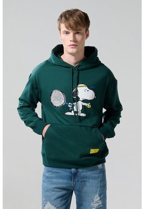 Buzo con capota para hombre en tono verde oscuro cuenta con bordes de ruedo y puños tejidos en rib, diseño de Snoopy en frente, manga larga, bolsillo delantero, cordón para anudar y una silueta ajustada. Esta prenda revolucionará tu armario, combínala con tus jeans favoritos y lúcela cualquier día de la semana.