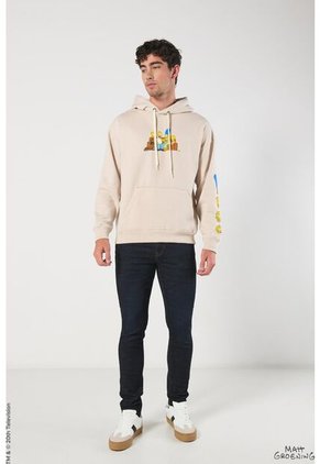 Buzo para hombre con capota kaki claro cuenta con cordón para anudar, diseños de Los Simpson localizados, puños y ruedo tejidos en rib, bolsillo delantero y un fit oversize en el cuerpo. Crea tu mejor outfit descomplicado combinando esta prenda con tus jeans anchos favoritos, así marcarás la diferencia en tu próxima salida con amigos.