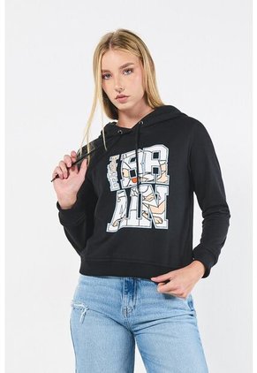 Buzo cuello redondo para mujer en tono negro cuenta con borde inferior y puños con acabados en rib, diseño de Pinky y Cerebro en frente, cordón para anudar y un fit ligeramente ajustado al cuerpo. Si estás tratando de conquistar al mundo esta prenda será prefecta para hacerlo, combínala con un jean mom y marca la diferencia en todo momento.
