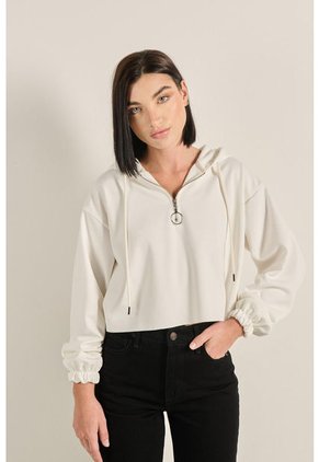Buzo con capota para mujer en tono crema claro cuenta con cierre con cremallera, elástico en puños, hombro rodado, cordón ajustable y una horma oversize en el cuerpo. Inspirada en la moda streetwear, podrás combinarlo con un jean cargo y crear un look descomplicado perfecto para tus planes con amigos.