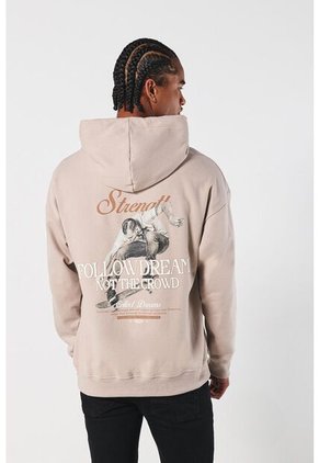 Buzo kaki claro con capota para hombre cuenta con diseños urbanos en frente y espalda, puños y ruedo tejidos en rib, bolsillo delantero, hombro caído, cordón para anudar, manga larga y un fit oversize. Para los planes descomplicados esta prenda será el complemento perfecto. ¡Con un jean ancho crearás un look streetwear!