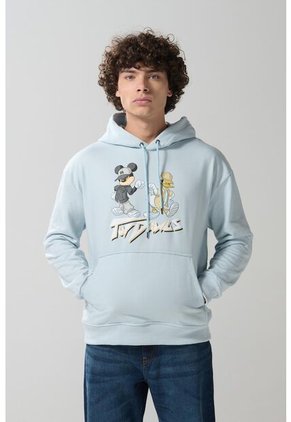 Buzo con capota azul medio para hombre con tejido en rib en puños y el ruedo, hombro rodado, con estampado localizado de Mickey. en el frente. Con esta prenda completa tu outfit y crea un estilo tan único como tú.