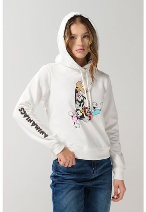Buzo con capota para mujer en tono crema claro cuenta con puños y ruedo tejidos en rib, diseños de Animaniacs localizados, cordón para anudar, manga larga y un fit ligeramente ajustado. Añade un jean mom a tu total look y dale un toque de encanto a tu estilo. ¡Te robarás todas las miradas!