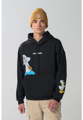 Buzo con capota negro para hombre con tejido en rib en puños y el ruedo, hombro rodado, con estampado localizado de Mickey. en el frente. Con esta prenda completa tu outfit y crea un estilo tan único como tú.