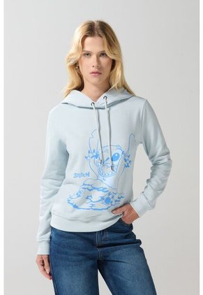 Buzo azul claro con capota para mujer cuenta con diseños de Lilo & Stitch (Disney) localizados, puños y ruedo en rib, cordón para anudar, manga larga y un fit ligeramente ajustado al cuerpo. Lúcelo con un jean jegging, será la combinación perfecta para crear un look arriesgado para llevar a tus planes casuales.