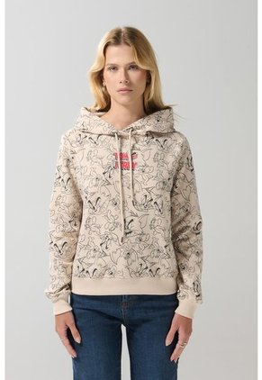 Buzo con capta kaki claro para mujer cuenta con cordón para anudar, tejido en rib en ruedo y puños, diseños de Tom y Jerry estampados, manga larga y un fit sutilmente ajustado. ¡Crea un look ideal para cualquier día de la semana! Con un jean y un par de tenis chunky serás el centro de todas las miradas.