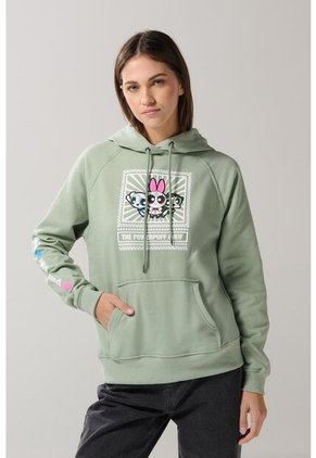 Buzo con capota para mujer en tono verde claro cuenta con manga ranglan larga, puños y ruedo tejidos en rib, bolsillo delantero, diseños de las Chicas Superpoderosas, cordón para anudar y una silueta holgada. Renueva tu guardarropa con esta prenda, será la opción perfecta para lucir con tus jeans favoritos en tu próxima salida con amigos.