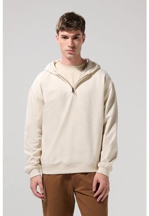 Buzo con capota kaki claro para hombre, elaborado en tela perchada, cuenta con ruedo y puños en rib, hombro caído, manga larga, cierre con cremallera en pechera y una horma oversize. Esta es una prenda atemporal e infaltable que podrás combinar con tus jeans favoritos y lucir en tu próxima salida con amigos.
