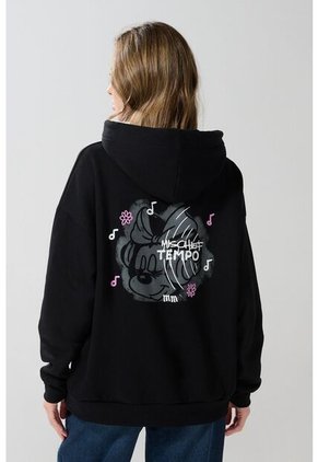 Buzo negro con capota para mujer cuenta con ruedo y puños en rib, manga larga, diseños de Minnie (Disney) localizados, bolsillo delantero, cordón para anudar y una silueta oversize. Esta prenda hará un match perfecto con tu estilo, combínala con un jean holgado y crea un look con el que te destaques.