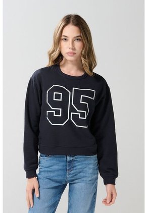Buzo cuello redondo azul intenso para mujer cuenta con tejidos en rib en ruedo y puños, manga larga, diseño college numérico estampado en frente y un fit ligeramente ajustado en el cuerpo. Esta es una prenda súper versátil con la que podrás crear cientos de combinaciones para lucir en tus planes cotidianos.