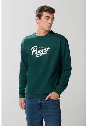 Buzo cuello redondo verde oscuro para hombre cuenta con bordes de puños y ruedo tejidos en rib, manga larga, hombro rodado, diseño college en frente y un fit ligeramente ajustado al cuerpo. Crea un outfit fiel a tu estilo combinando esta prenda con tus jeans o joggers favoritos. ¡Marcarás la diferencia!