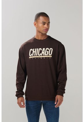 Buzo café oscuro cuello redondo para hombre cuenta con manga larga, bordes de ruedo y puños tejidos en rib, texto college blanco estampado en frente y un fit ligeramente ajustado al cuerpo. Esta prenda es perfecta para combinar con tu mejor jean y crear un total look ideal para los climas más fríos.