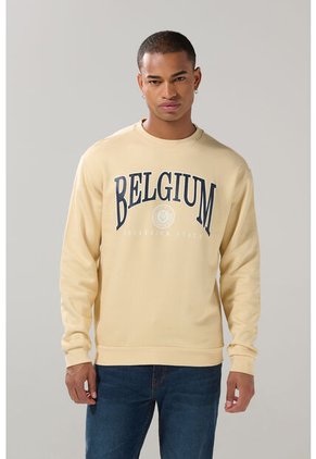 Buzo kaki claro cuello redondo para hombre cuenta con hombro rodado, bordes de ruedo y puños tejidos en rib, texto college estampado en frente, manga larga y un fit ligeramente ajustado. Esta prenda tiene un estilo juvenil que podrás combinar con tus jeans favoritos y lucir cualquier día de la semana.