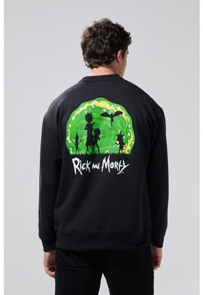 Buzo negro cuello redondo para hombre cuenta con ruedo y puños tejidos en rib, diseños de Rick and Morty en frente y espalda, hombro rodado, manga larga y un fit ajustado a la silueta del cuerpo. Esta prenda será perfecta para armar looks versátiles con los que te inspires a crear una nueva versión de ti en cada salida.