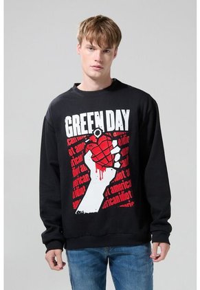 Buzo para hombre cuello redondo negro cuenta con ruedo y puños tejidos en rib, diseño de Green Day localizado en frente, hombro rodado, manga larga y un fit ligeramente ajustado. ¿Saldrás de concierto y aún no decides qué ponerte? Esta prenda, combinada con un jean straight leg, serán el complemento perfecto para tu look.