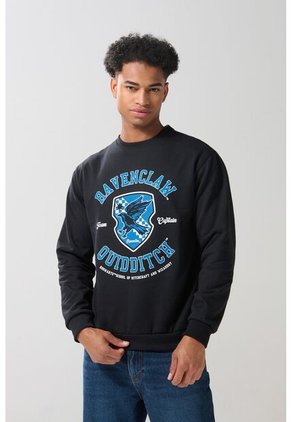 Buzo cuello redondo para hombre en tono negro cuenta con hombro rodado, puños y ruedo tejidos en rib, manga larga, diseño de Harry Potter en frente y una silueta ajustada al cuerpo. Esta es una prenda súper versátil que debes tener en tu armario, con un jean o una bermuda crearás un look mágico.