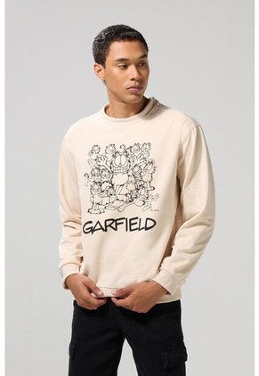 Buzo kaki claro cuello redondo para hombre cuenta con hombro rodado, bordes de ruedo y puños en rib, diseño de Garfield localizado en frente, manga larga y un fit ligeramente ajustado al cuerpo. Luce tu mejor versión con esta prenda, una infaltable que podrás combinar con jeans o pantalones de dril.