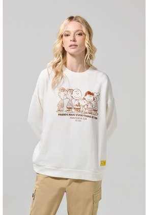 Buzo crema claro cuello redondo para mujer cuenta con bordes de puños y ruedo en rib, diseño de Snoopy en frente, hombro caído, manga larga y un fit oversize en el cuerpo. Renueva tu guardarropa con esta prenda, será la opción perfecta para lucir con tus jeans favoritos en tu próxima salida con amigas.