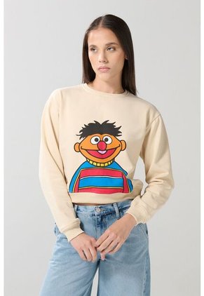 Buzo para mujer cuello redondo kaki claro cuenta con ruedo y puños tejidos en rib, manga larga, hombro rodado, diseño de Plaza Sésamo localizado en frente y un fit sutilmente ajustado al cuerpo. Esta prenda es un clásico que se renueva con su estilo moderno, combínala con tus jeans favoritos y lúcela en tus planes casuales.