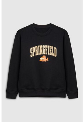 Buzo negro cuello redondo para niño, elaborado en tela perchada, cuenta con puños y ruedo en rib, hombro rodado, manga larga, diseño en frente de Los Simpson y una silueta holgada. Crea un outfit fiel a tu estilo combinando esta prenda con tus jeans o joggers favoritos. ¡Marcarás la diferencia!