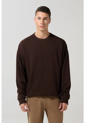 Buzo para hombre en tono café oscuro, confeccionado en material perchado, cuenta con cuello redondo, bordes de puños y ruedo en rib, hombro caído, manga larga y un fit oversize. El estilo y la comodidad van de la mano con esta prenda, lúcela con un pantalón jogger y disfruta de tus días de relax en casa.