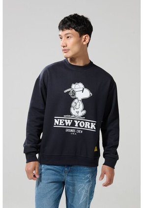 Buzo cuello redondo para hombre en tono azul intenso cuenta con diseño de Snoopy en frente, bordes de ruedo y puños en rib, hombro rodado, manga larga y un fit ligeramente ajustado. Siéntete moderno y cómodo con esta prenda, combínala con jeans slim y luce radiante en los climas más fríos.