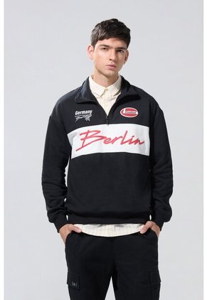 Buzo para hombre cuello alto con cremallera en frente fit oversize, estampado en frente y espalda estilo college.