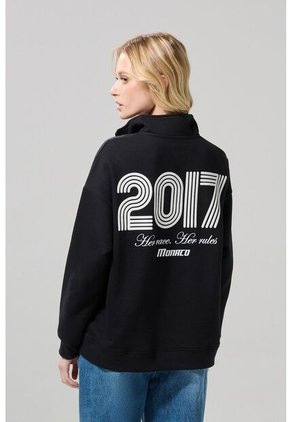 Buzo cuello sport para mujer en tono negro cuenta con ruedo y puños tejidos en rib, manga larga, cierre con cremallera en pechera, hombro caído, diseño college en frente y un fit oversize. ¡Esta será una de tus prendas favoritas! Combínala con tu mejor jean y lúcela para darles estilo a los días fríos.