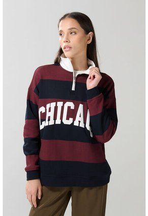 Buzo azul intenso cuello alto para mujer cuenta con puños y ruedo en rib, rayas en contraste, diseño college en frente, cierre con cremallera en pechera y un fit oversize en el cuerpo. Dale a tu look un estilo único con esta prenda, combínala con tu mejor jean y lleva tu outfit a tus planes con amigas en el centro comercial.