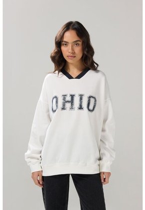 Buzo crema claro para mujer cuenta con ruedo y puños en rib, cuello V en contraste, manga larga, hombro caído, diseño college localizado en frente y una silueta oversize en el cuerpo. ¿Buscas una prenda que te saque de apuros? ¡Esta es la indicada! Combínala con tus jeans favoritos y crea atuendos perfectos para todos tus planes.